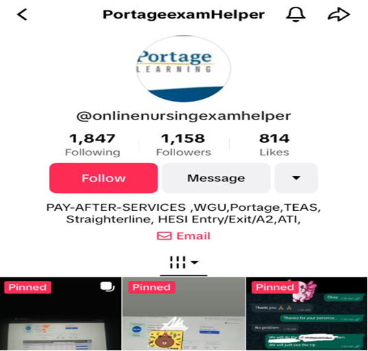TikTok profile advertising to complete nursing exams and coursework in exchange for a fee.