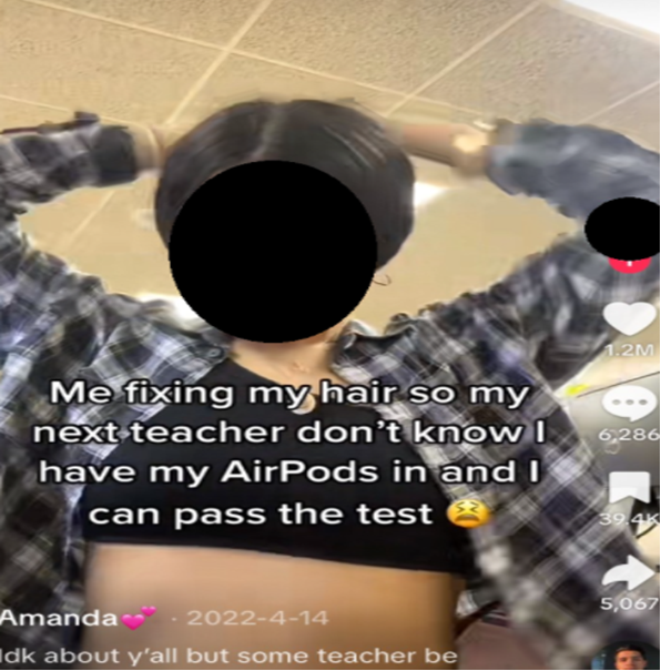Video from TikTok where the creator uses their hair to hide their wireless earphones during an in-class assessment.