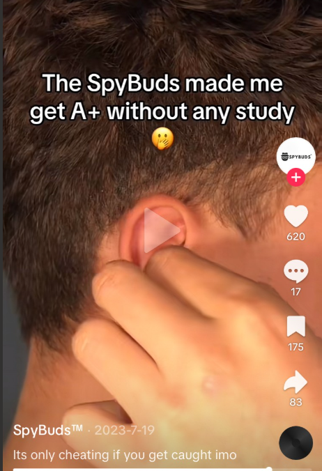 Video from TikTok where the creator is advertising the use of “SpyBuds”, discreet, wireless earpieces which are being advertised as a means of cheating in an assessment.