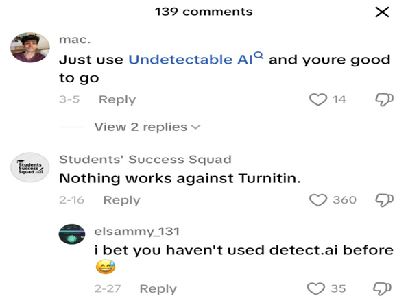 @mac.,@Student’ Success Squad, @elsammy_131. Comments on @tasha.aithor “Produce undetectable essays with aithor.com #aithorai #studytips #aitools #freshersadvice” TikTok, uploaded by @tasha.aithor, February 10, 2025, https://vm.tiktok.com/ZNdLUgVbx/.