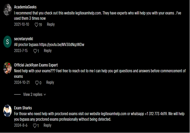 Comment thread under a video where commenters are sharing details, and websites, to help them cheat on proctored exams.