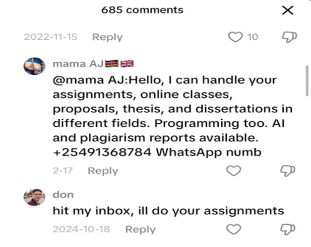 Comment thread under a TikTok video where commenters are offering to complete assessments and coursework.