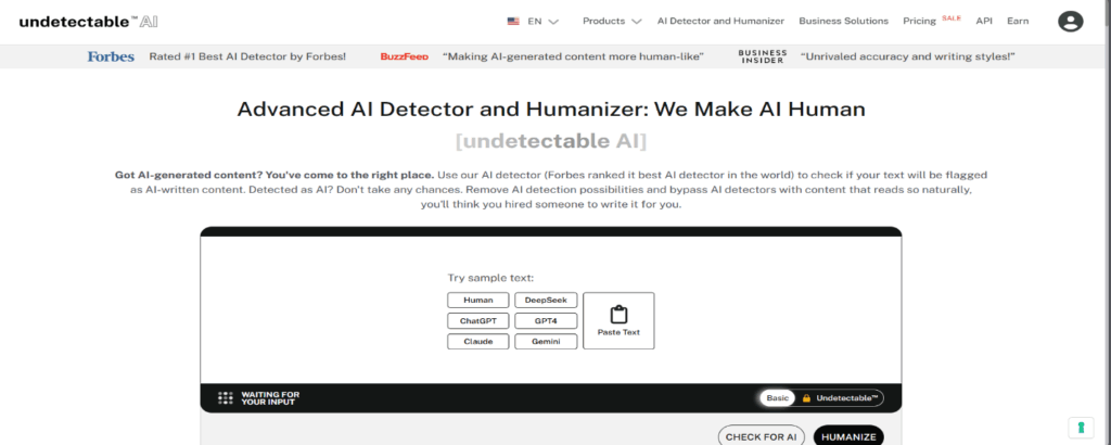 Homepage for Undetectable AI, which has a text box where AI generated content can be copied, pasted and humanized.