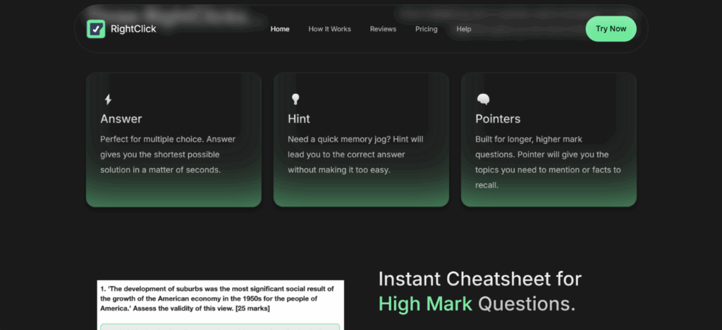 Homepage of RightClick, a browser extension that offers answers, hints, and pointers for online assessments.