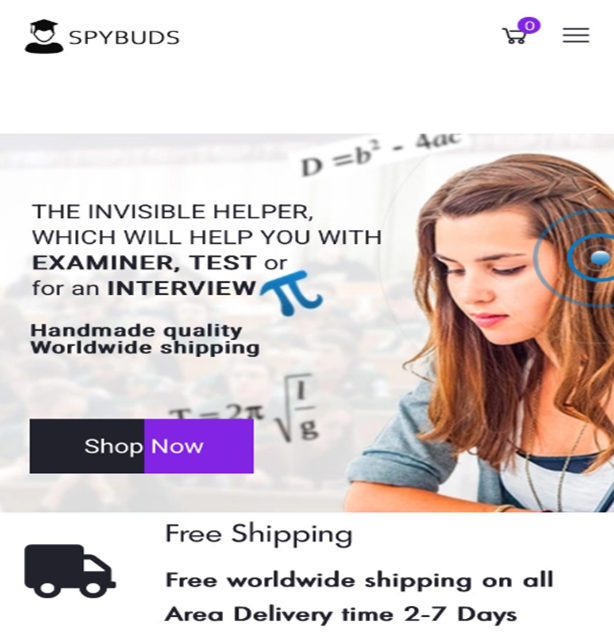Homepage of Spybuds: the website sells discreet earpieces which are advertised for the purpose of cheating.